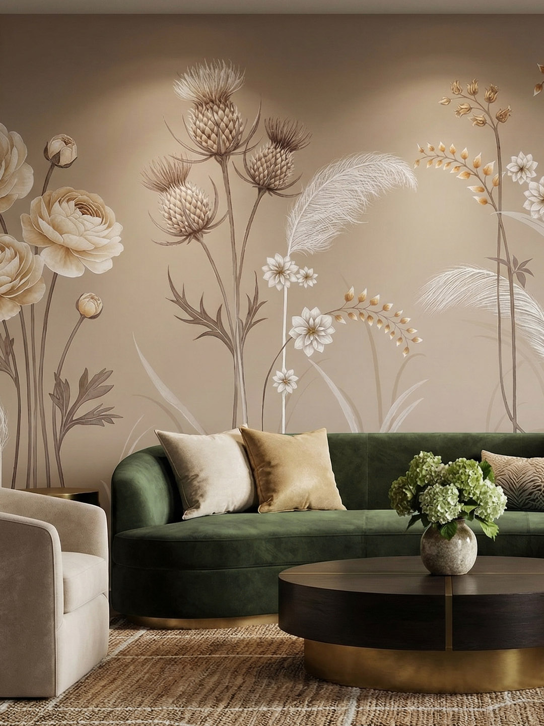 Meadow Whispers captures the serene beauty of an untouched wild garden. Featuring a delicate arrangement of blooming flora, thistles, and swaying wild grasses growing elegantly from the bottom up, this design creates a grounded yet airy atmosphere. The vintage-inspired botanical illustrations bring a touch of the outdoors inside, offering a soft, organic texture to your walls without overwhelming the space.