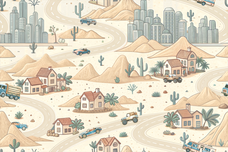 A playful desert scene with winding roads, cacti, and small houses, this wallpaper features cars traveling through sandy hills and cities, inspiring adventure in young minds.