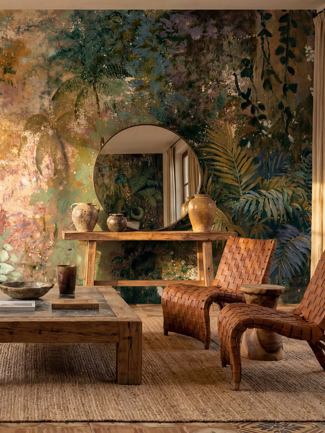 Transport your interior to a realm of timeless beauty with the “Tropical Fresco” wall mural. This masterpiece blurs the line between nature and fine art, drawing inspiration from weathered frescos and classical oil paintings found in historic estates. The design features a dense, lush canopy of palm leaves, ferns, and exotic foliage, rendered with a sophisticated, distressed technique that mimics the patina of age.